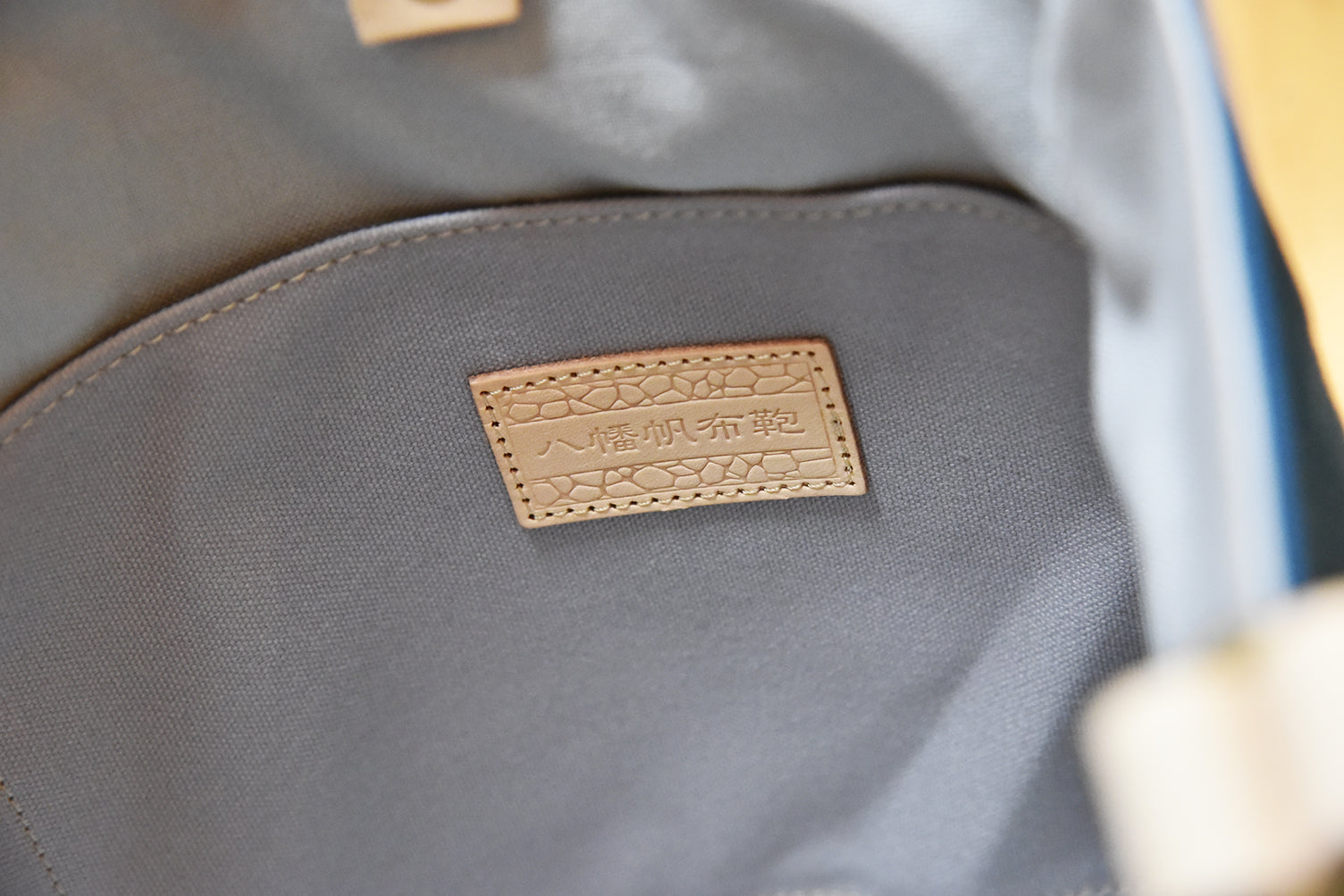 「八幡帆布鞄」の刻印が入ったレザーのカラーラインがデザインを引き締めます。