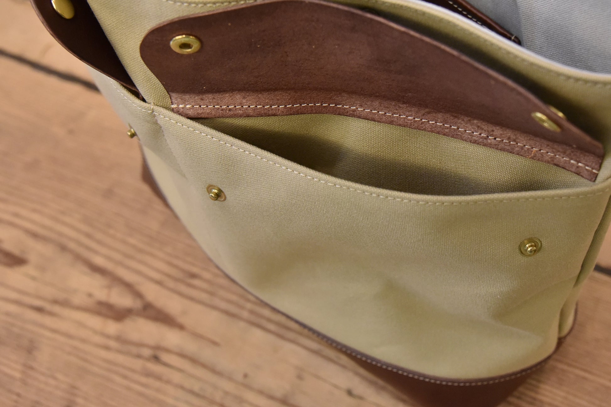 落ち着いた色合いのライトブラウンの帆布とダークウォルナット近江牛レザーのカラーリングは大人の上品で落ち着いた雰囲気になる様、製作しました。