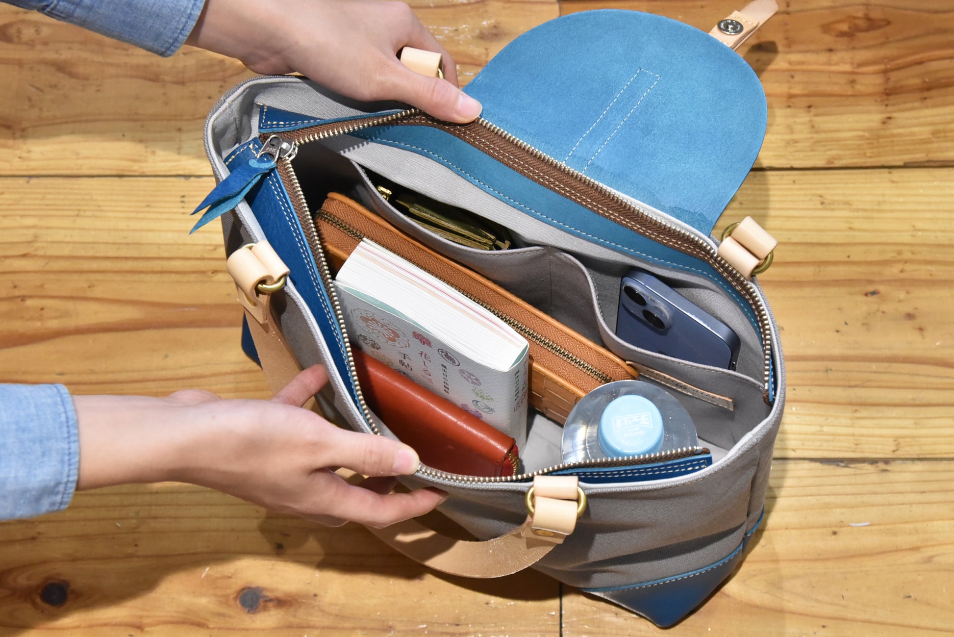 近江牛レザーのブルーが映えるよう帆布はシンプルな色を選び、