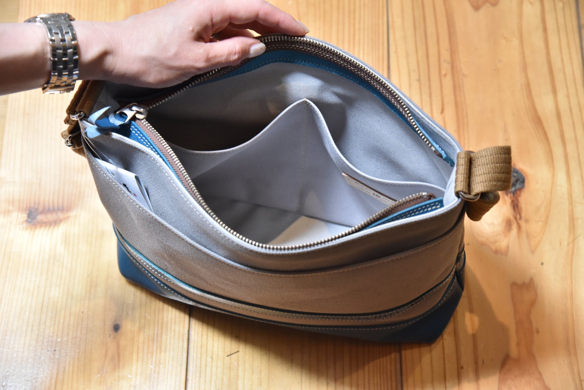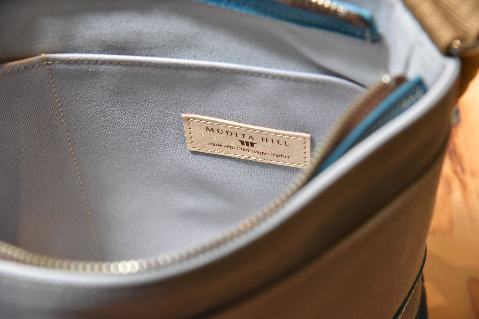 ファスナー、内ポケットにはブルーの近江牛を使用。