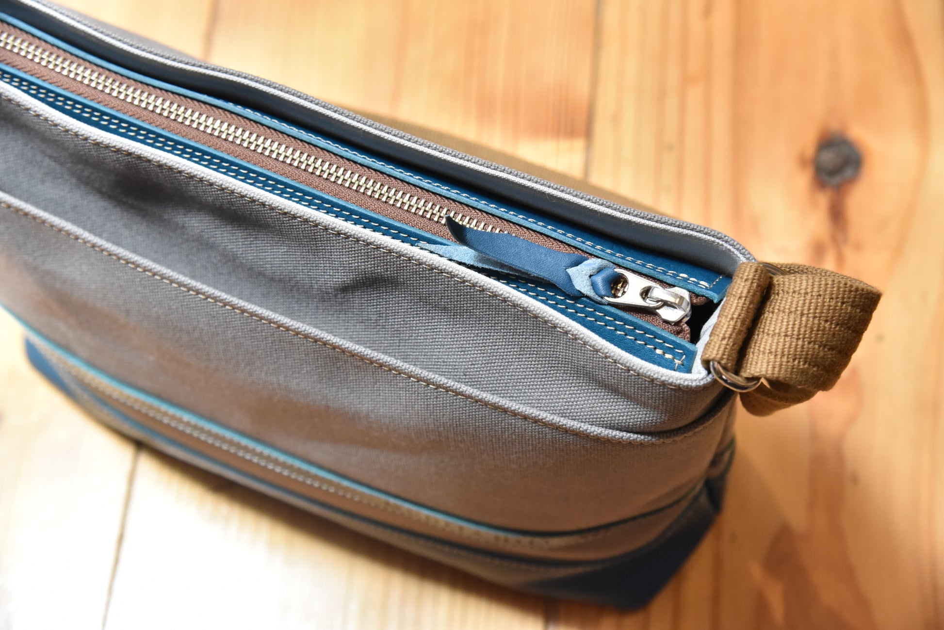 優しい色合いのグレーの帆布と近江牛レザーのカラーリングは