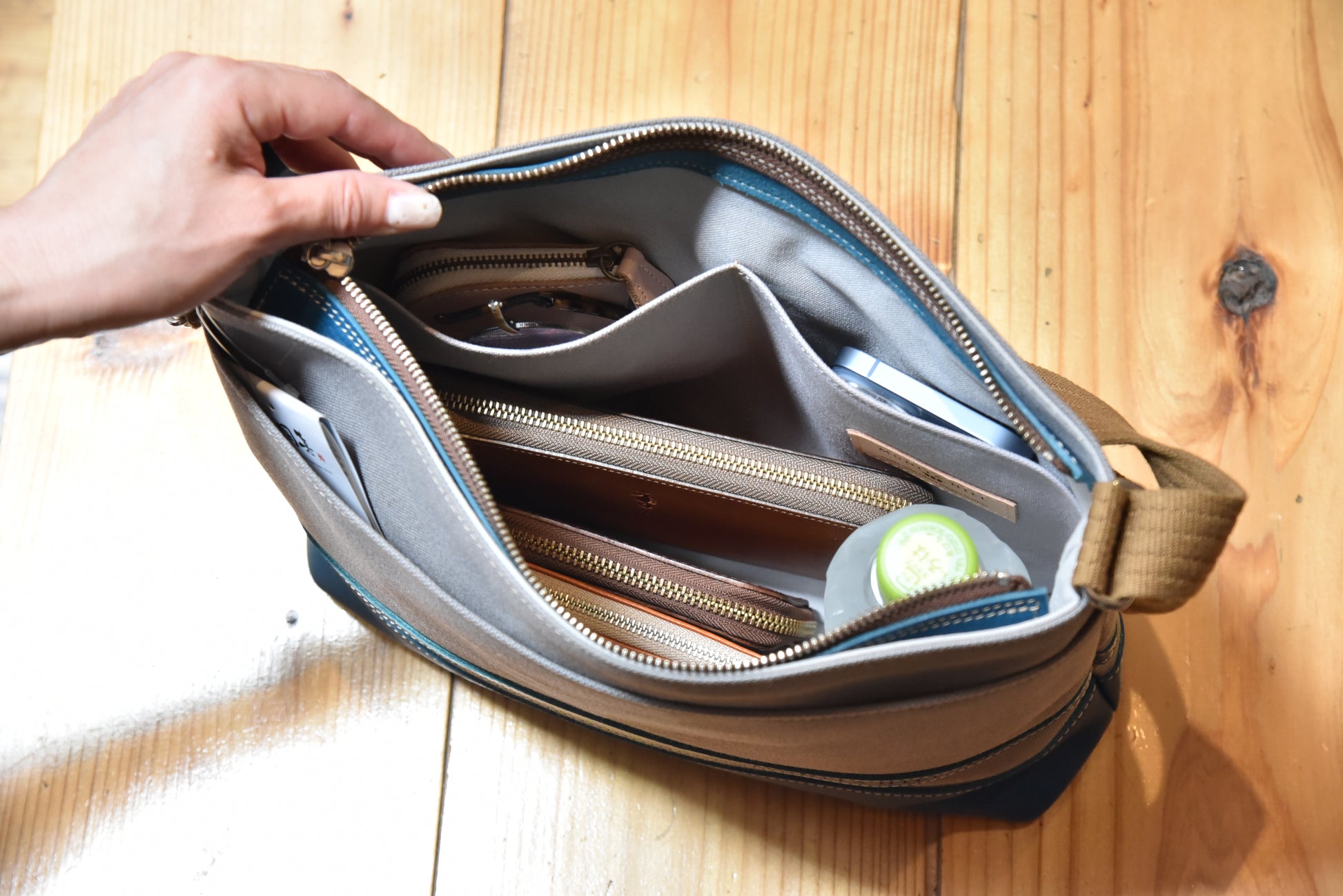 MUDITA HILL|岡喜近江牛と高島帆布で作ったよこショルダーバッグ Mサイズ【グレー×びわ湖ブルー】