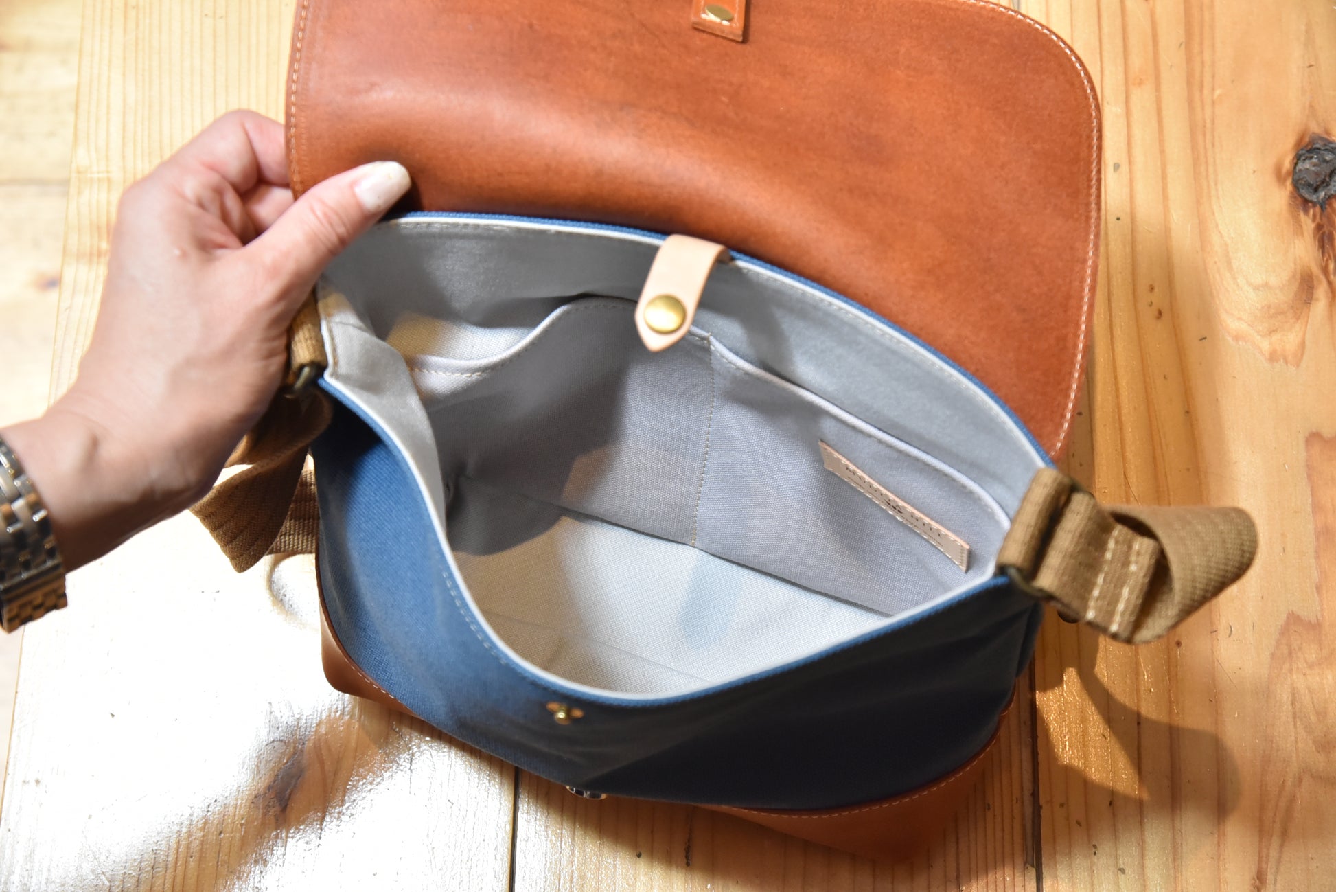 美しい琵琶湖ブルーの帆布とブライトキャメルの革の